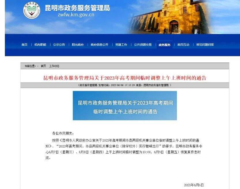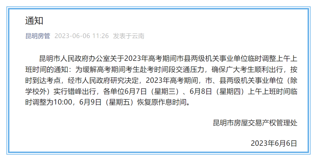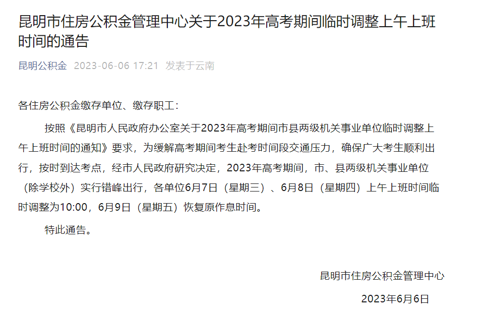 昆明市人民政府办公室关于2023年高考期间市县两级机关事业单位临时调整上午上班时间的通知:为缓解高考期间考生赴考时间段交通压力,确保广大考生顺利出行,按时到达考点,经市人民政府研究决定,2023年高考期间,市、县两级机关事业单位(除学校外)实行错峰出行,各单位6月7日(星期三)、6月8日(星期四)上午上班时间临时调整为10:00,6月9日(星期五)恢复原作息时间。