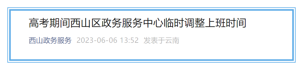 按照《昆明市人民政府办公室关于2023年高考期间市县两级机关事业单位临时调整上午上班时间的通知》,“2023年高考期间,市县两级机关事业单位(除学校外)实行错峰出行”的要求,昆明市政务服务中心6月7日(星期三)、6月8日(星期四)上午上班时间临时调整为10:00,6月9日(星期五)恢复原作息时间。