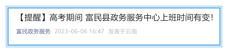 根据《昆明市人民政府办公室关于2023年高考期间市县两级机关事业单位临时调整上午上班时间的通知》要求,为缓解高考期间考生赴考时间段交通压力,确保广大考生顺利出行,按时到达考点,富民县政务服务中心2023年6月7日(星期三)、6月8日(星期四)上午上班时间临时调整为10:00,6月9日(星期五)恢复原上班时间。