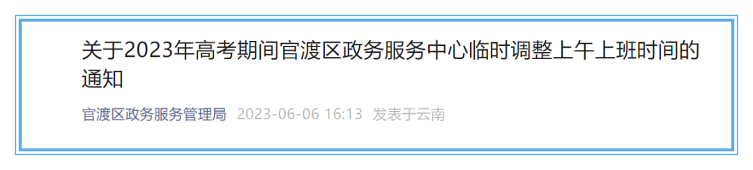 关于2023年高考期间官渡区政务服务中心临时调整上午上班时间的通知