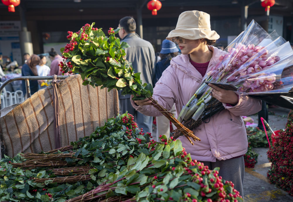 一名顾客在昆明斗南花市购买鲜花 陈欣波 摄