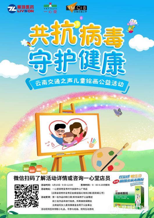 6686体育讯 记者曹芸 由电台FM91.8交通之声联合云南省妇女儿童发展基金会发起,一心堂药业和丽珠医药共同主办的“共抗病毒 守护健康”儿童公益绘画活动持续进行中。6月10日上午,一心堂昆明呈贡时代俊园中心广场店迎来了“共抗病毒 守护健康”儿童公益绘画路演的第三场。