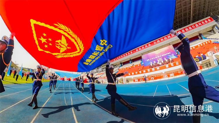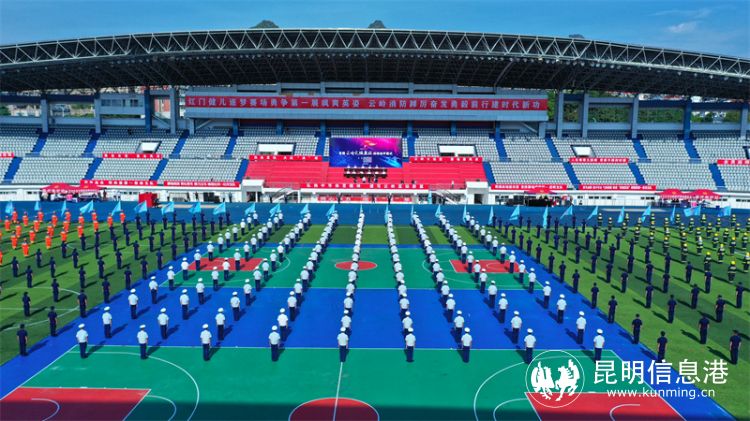 上午9时,伴着雄壮的《歌唱祖国》乐曲,18名威武的礼兵高举中华人民共和国国旗、国家综合性消防救援队伍队旗、首届“云岭火焰蓝杯”运动会会旗,迈着铿锵的正步通过主席台。迎旗仪式后,全场高唱中华人民共和国国歌,五星红旗冉冉升起;在首届“云岭火焰蓝杯”运动会会歌《燃烧吧,云岭火焰蓝》歌声中,国家综合性消防救援队伍队旗和首届“云岭火焰蓝杯”运动会会旗同时升起,国旗、队旗、会旗交相辉映、迎风飘扬,运动员、裁判员代表庄严宣誓。