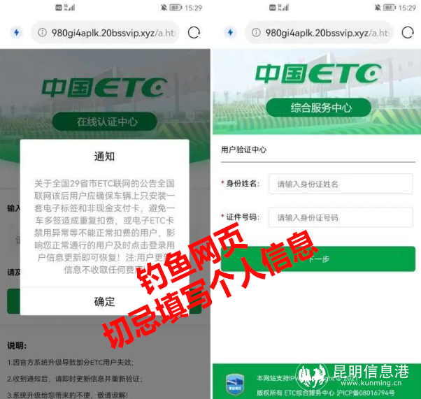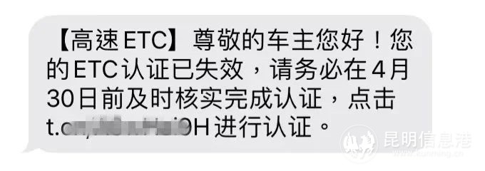 近日,昆明警方接到群众反映,收到一条“ETC提醒”短信,昆明警方经鉴别明确回复:假的!是电信网络诈骗!
