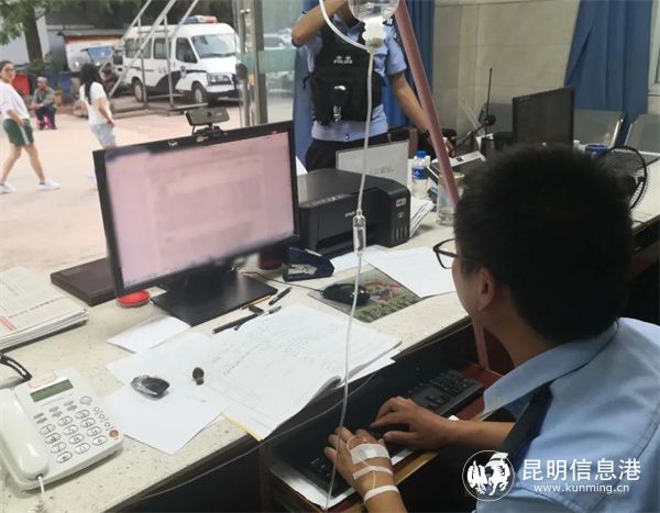 日前,嵩明县公安局杨桥派出所一名辅警因病入院治疗,恰逢周末驻所警力有限,于是他把吊瓶搬进值班室,一边输液一边工作。
