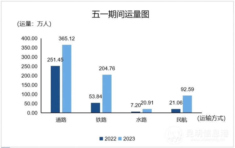 值得注意的是,在五一假期,云南省文化和旅游业持续保持强劲复苏,云南综合运输生产高位运行,客运需求旺盛。在此期间,全省道路运输投入客车数量18.03万辆,同比增长7.28%,完成客运量365.12万人次,同比增长45.21%;投入客运船舶3505艘次,同比增长24.34%,完成客运量20.91万人次,同比增长190.48%;省内机场保障运输起降航班7667架次、旅客吞吐量92.59万人次,同比分别增长249.77%和339.62%;铁路开行列车2290列,累计发送旅客204.76万人次,同比增长280.3%。