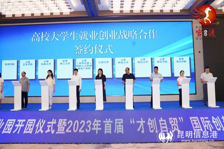 开园活动当天,中国官渡2023年首届国际创新创业大赛也在此拉开了序幕。大赛以“才创自贸”为主题,立足云南本地,结合官渡自贸区优势,面向南亚东南亚,通过展会、创赛、分享、发布等形式,汇聚国际双创人才,全方位展现创业生态及创新科技前沿力量,为创业者及创新生态提供创新思维展示交流的平台。活动邀请了省内人力资源服务骨干企业,行业领军人物,创新创业联盟代表,创业导师等多位专家到场,共同见证园区开园和大赛盛事,活动现场进行了大学生创新创业联盟成立。