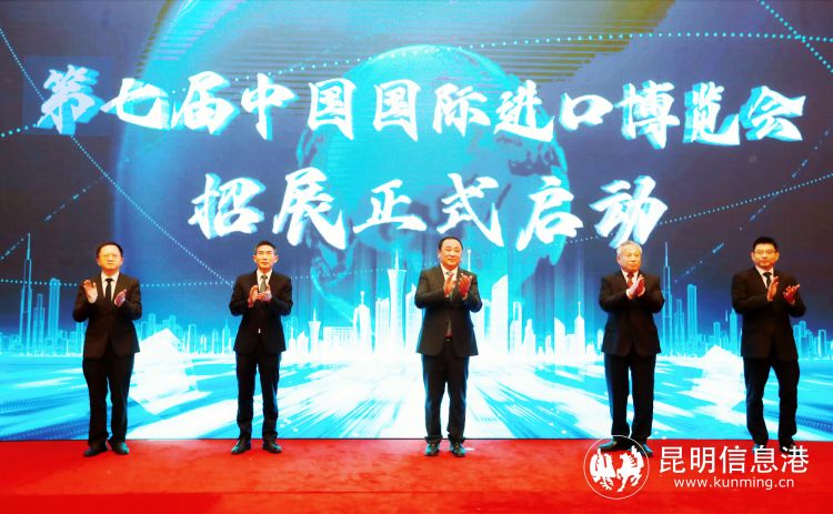 中国国际进口博览局副局长孙成海,商务部服贸司司长王东堂,中国国际进口博览局副局长刘福学,云南省商务厅副厅长冯震,中国银行总行交易银行部副总经理李晓玮共同启动第七届进博会招展。