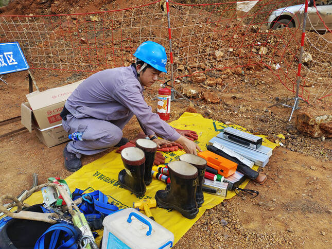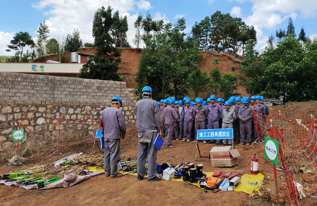 紧接着召开了施工现场安全会,交代了作业内容、各安全注意事项及现场检查施工工器,随后工人们分组前往各个作业点进行施工。
