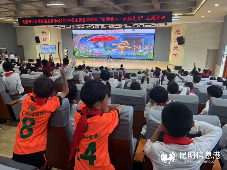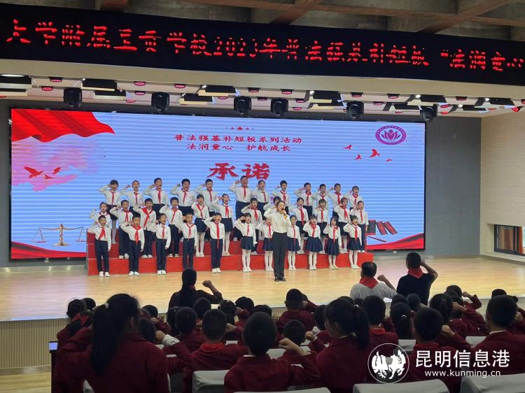 师生共筑信念,增强法治观念。为进一步使法律课堂+情景剧承上启下、入脑入心,昆明理工大学附属呈贡学校老师们以朗诵的形式,声情并茂为大家礼赞法律,随后教师代表带领全体师生作出承诺,引导他们从小树立法治观念,养成自觉守法、遇事找法、解决问题靠法的思维习惯和行为方式,让同学们充分认识到法律与未成年人成长和保护的密切关系,加强“法治在身边”的感受,活动最后,在校园普法歌的愉悦氛围中收获了丰富实用的法律知识,推动普法教育落地见效。
