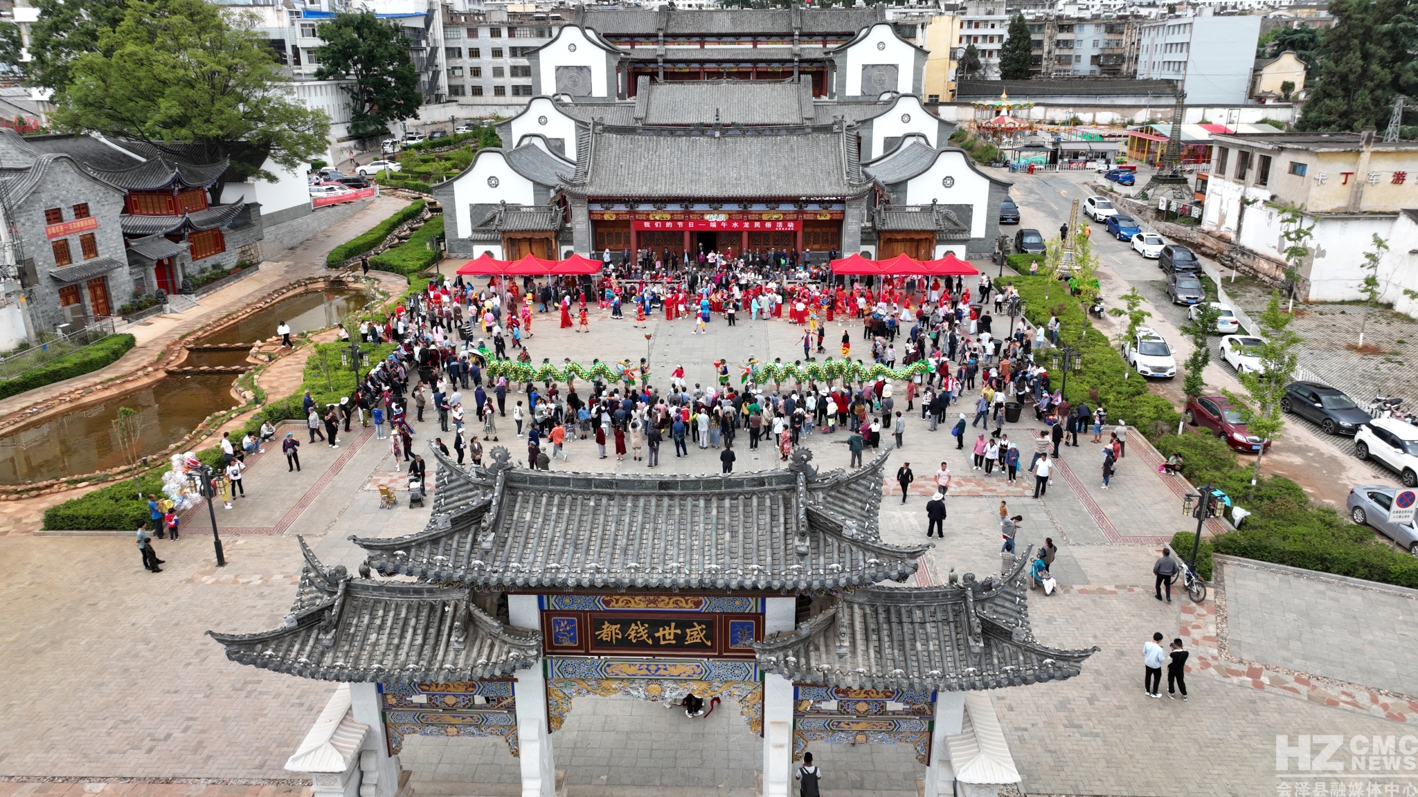 当天中午1点16分,表演队伍身着各式鲜艳的服饰,伴随着锣鼓声,沿着街道开始巡游。所到之处,人们蜂拥跟随。下午2时,由二十个头戴柳帽的壮汉高举的两条“水龙”,在大家的簇拥下,来到会泽古城的博物馆广场,结束巡游,开始“耍水龙”表演活动。