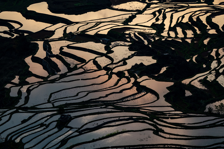 2022年1月3日,地处云南省红河哈尼族彝族自治州元阳县的哈尼梯田蓄水充盈,在阳光的照射下色彩丰富,美不胜收。新华社发(甘与汇摄)