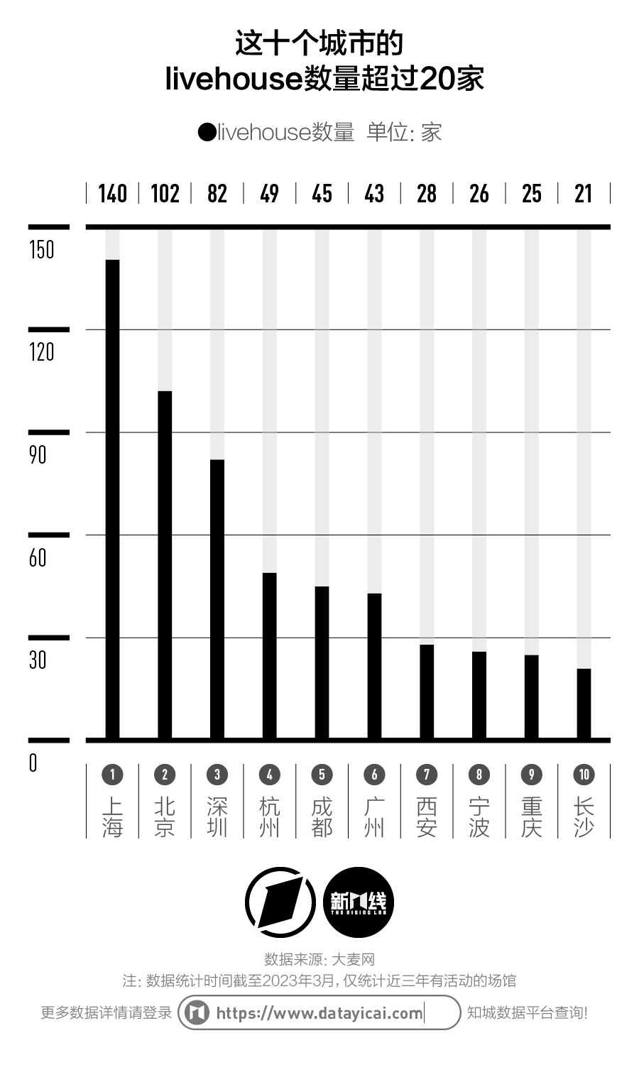 以去livehouse看演出这项娱乐为例,拥有20家以上livehouse 的城市共计10座,上海和北京的供给仍处于绝对优势地位。虽然过去一年里演出市场还未全面进入复苏阶段,头部城市的展演格局依然呈现出各自的特色——上海和深圳演出类目保持了丰富的多样性,北京的曲艺类演出独具特色。