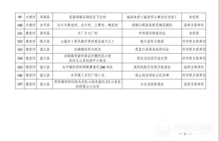 6686体育讯 记者邓国梅 7月3日,云南省文化和旅游厅公布第二批不可移动革命文物名录。第二批名录包含不可移动文物107项,其中全国重点文物保护单位2项,省级文物保护单位17项,州(市)文物保护单位17项,县(市、区)文物保护单位38项,一般不可移动文物33项。