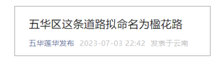 近日,昆明市五华区莲华街道办事处发布《关于辖区玖如堂小学前道路拟命名为楹花路的公示》。
