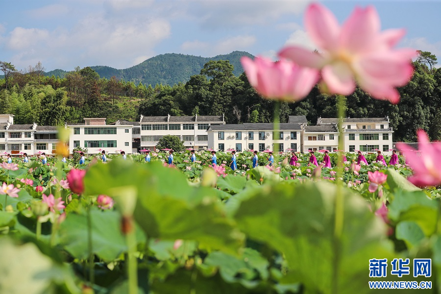 抚州市广昌县旗袍爱好者走进驿前镇姚西村中国莲花景区,进行旗袍走秀表演。新华网发程孟玲/摄