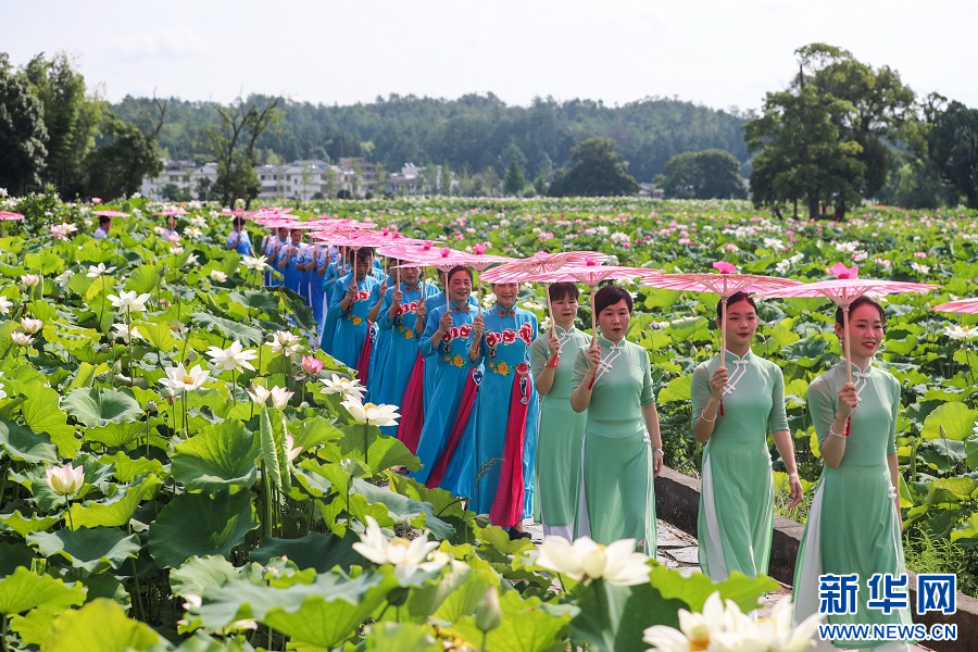 抚州市广昌县旗袍爱好者走进驿前镇姚西村中国莲花景区,进行旗袍走秀表演。新华网发曾恒贵/摄