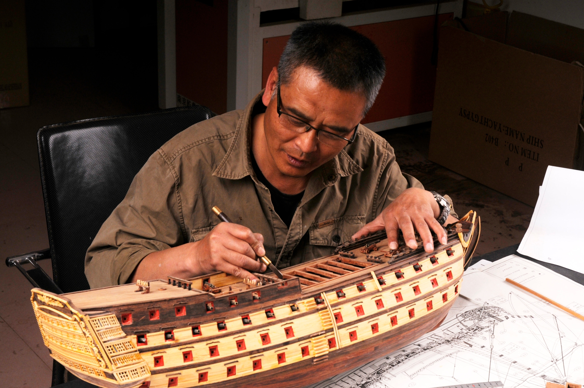 图为付昆祥在工作室制作郑和船模 受访者供图