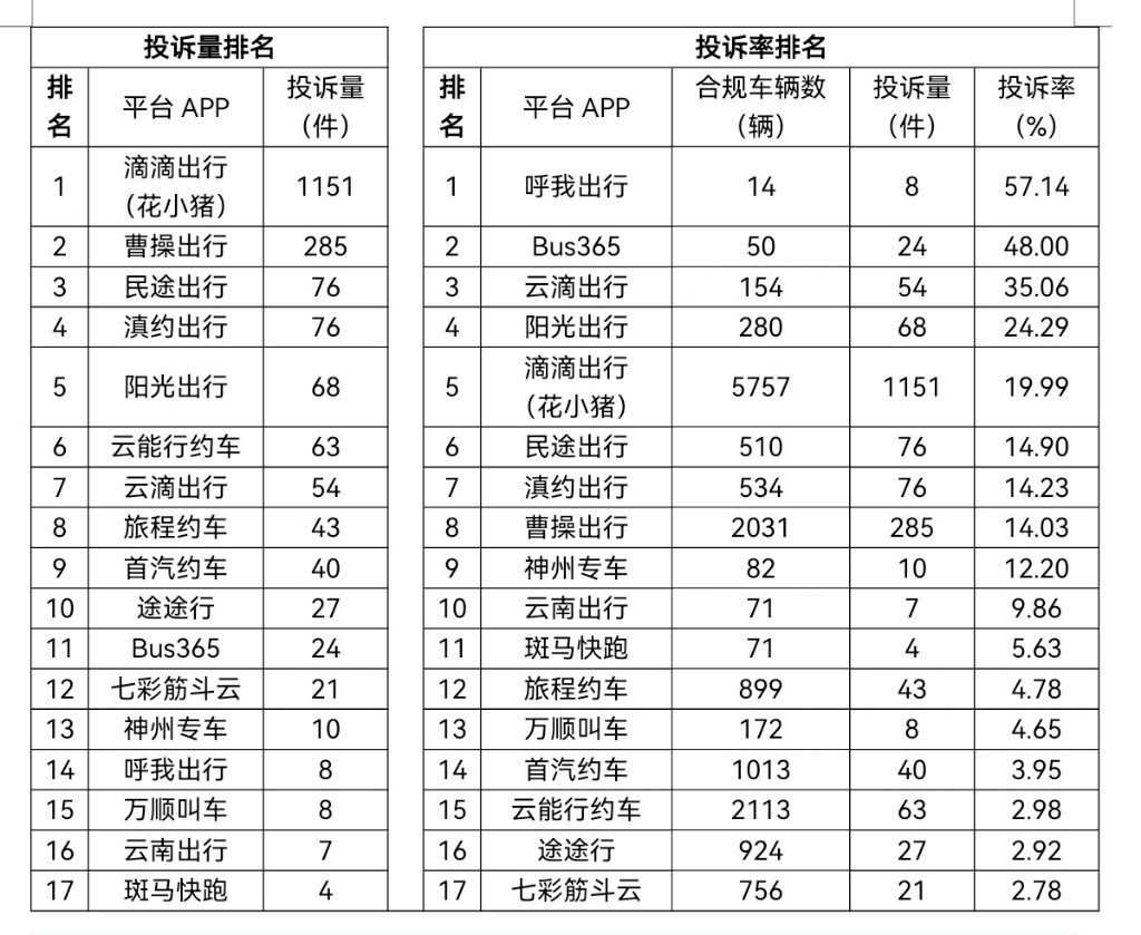 在涉及昆明市主城五区18家网约车平台公司的服务投诉排名中,投诉总量排名前五位的是“滴滴出行(花小猪)”“曹操出行”“民途出行”“滇约出行”和“阳光出行”;按照投诉量与合规网约车比例计算投诉率,排名前五位的是“呼我出行”“Bus365”“云滴出行”“阳光出行”“滴滴出行(花小猪)”。