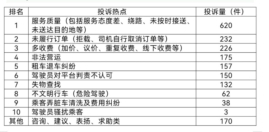 其中,涉及主城五区18家网约车平台公司的投诉事项,主要集中在 “服务质量”“未履行订单”“多收费”和“非法营运”等方面。投诉热点排名如下:
