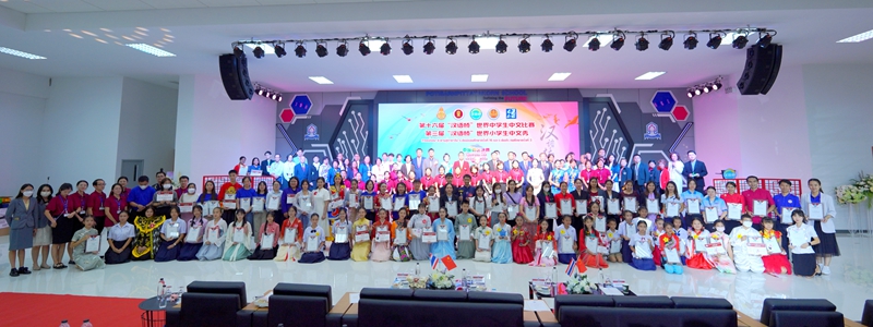 7月15日,2023年“汉语桥”世界中小学生中文比赛泰国赛区决赛参赛选手、组办者和嘉宾合影。(组织方供图)