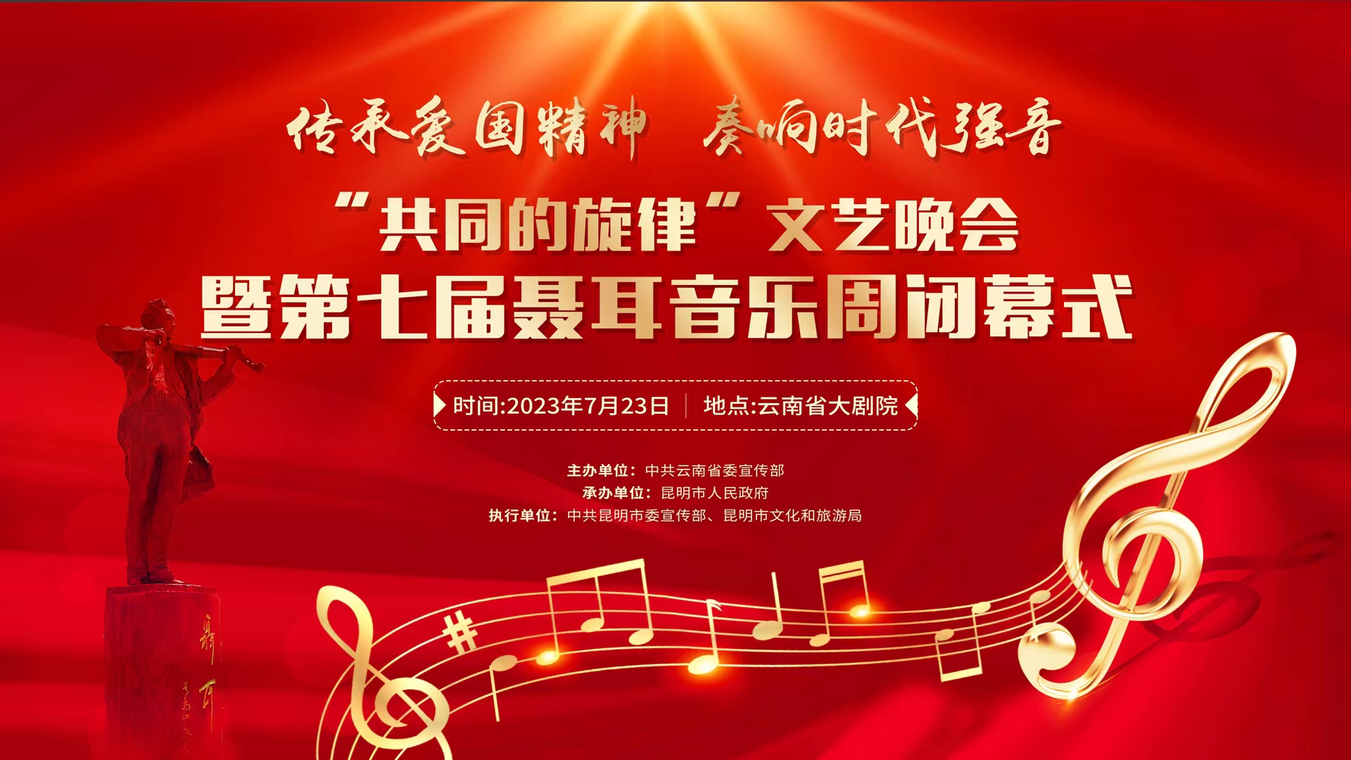 第七届聂耳音乐周由中共云南省委宣传部主办,以“传承爱国精神 奏响时代强音”为主题,采取“一体两翼”模式,于7月17日-23日同时在昆明、玉溪举办。