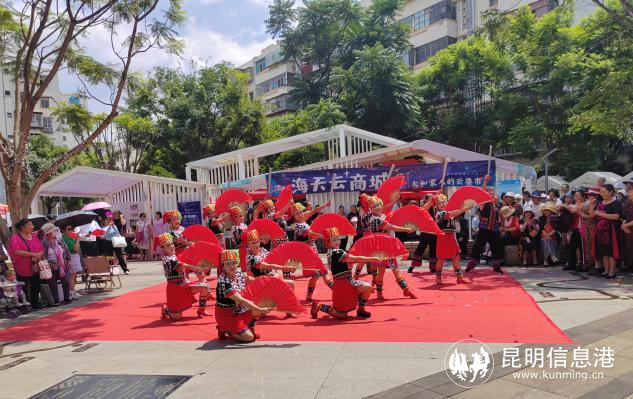 市集在精彩的歌舞表演中拉开序幕,现场人声鼎沸,热闹非凡,不少居民驻足在摊位前,体验各具特色的小吃美食和农副产品。