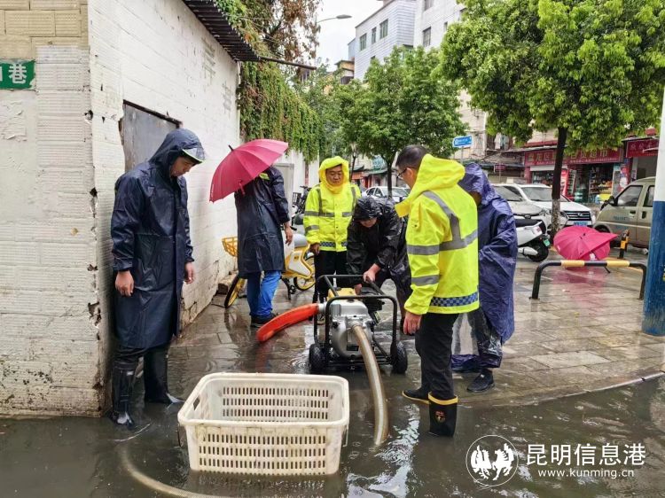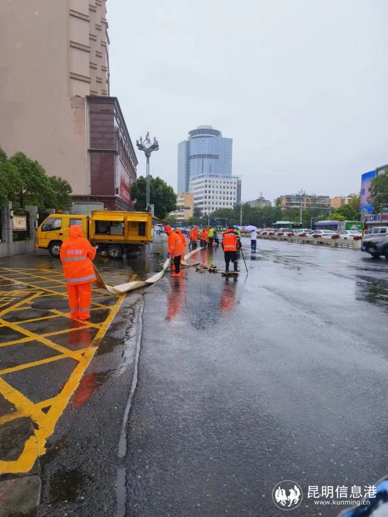 盘龙区防办、属地街道、排水公司、交警部门,在重点路段增加应急力量,做好交通疏导、人员及车辆劝离,同时全力抽排路面淹积水。