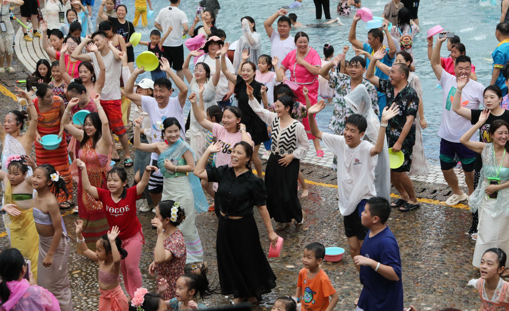 7月15日,游客在云南西双版纳傣族园景区感受傣迪舞蹈的乐趣。新华社发(李云生 摄)