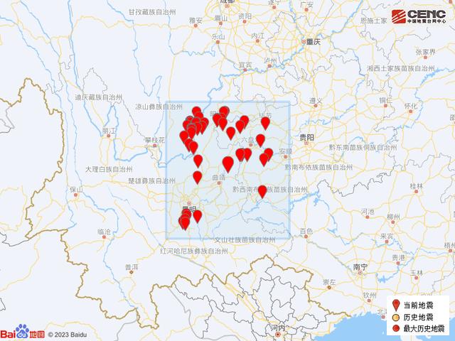 历史地震:根据中国地震台网速报目录,震中周边200公里内近5年来发生3级以上地震共52次,最大地震分别是2020年5月18日在云南昭通市巧家县发生的5.0级地震(距离本次震中172公里)和2018年8月14日在云南玉溪市通海县发生的5.0级地震(距离本次震中234公里),按震级大小前50次历史地震分布如图。