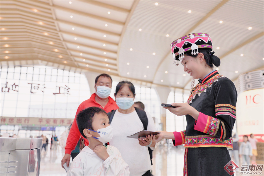 面对持续高位的暑运旅游客流,国铁昆明局在沿线各站增派会当地少数民族语言及英语的工作人员加强候车大厅的巡视,设立少数民族和中英文“双语”服务台,为少数民族及外籍旅客乘车提供便利。同时,各热门车站采取加开售票窗口及安检通道等措施,做好旅客出行引导和服务,避免人员集聚和通道堵塞。在昆明、昆明南、广通北、大理、玉溪、弥勒、红河7个车站实行站内便捷换乘,方便旅客乘车。