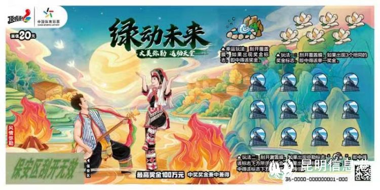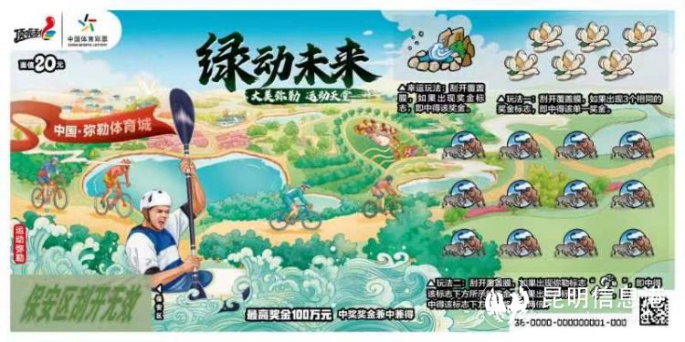 据了解,该款彩票面值为20元,最高可中100万元,是一款代表云南弥勒地区特色的即开票,也是云南发行的第六款地方主题即开型体育彩票。票面共有四个画面,分别是“运动弥勒”“风情弥勒”“灵秀弥勒”“生态弥勒”,票面设计以手绘插画的形式,展现了弥勒在体育赛事、民族风情、人文历史、地域文化四个方面的特色。“绿动未来”第一期发售规模为3600万元,将同步在全省9000多个网点销售。