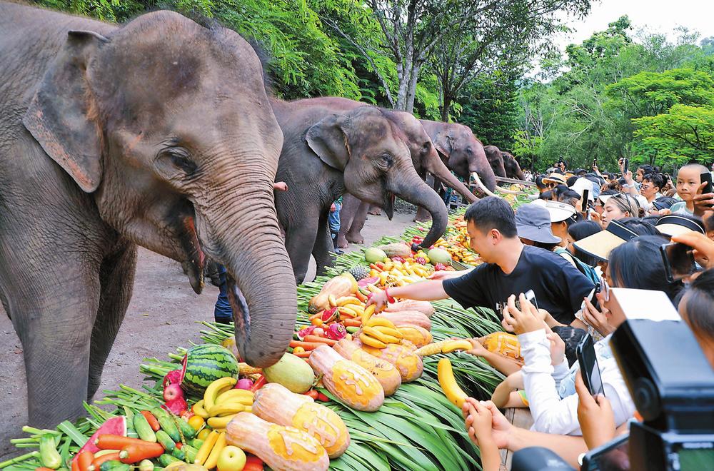 3吨多的各种水果和玉米等呈一字形堆放,随着一声哨响,16头亚洲象井然有序地享用起节日大餐;游客纷纷上前给大象喂食、合影留念,现场一派温馨和谐景象。