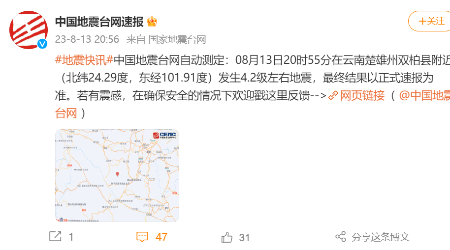 中国地震台网自动测定:08月13日20时55分在云南楚雄州双柏县附近(北纬24.29度,东经101.91度)发生4.2级左右地震,最终结果以正式速报为准。