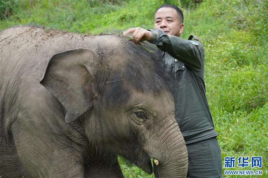 保明伟与救助象有爱互动。6月11日摄 新华网 柴静/摄