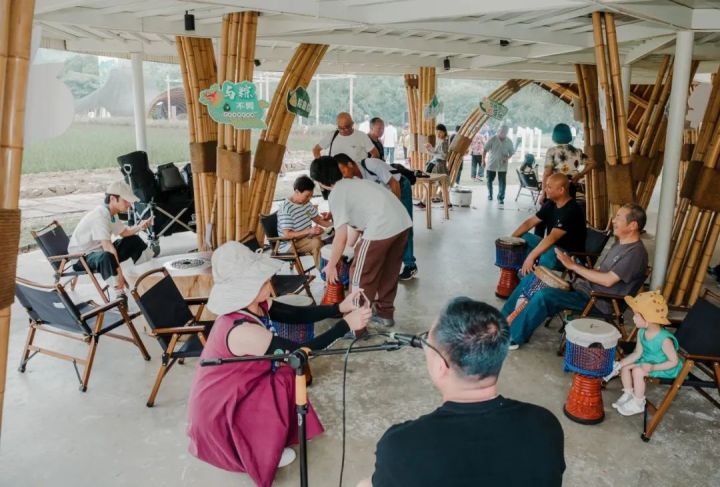 余村游客在竹建筑下体验非洲鼓