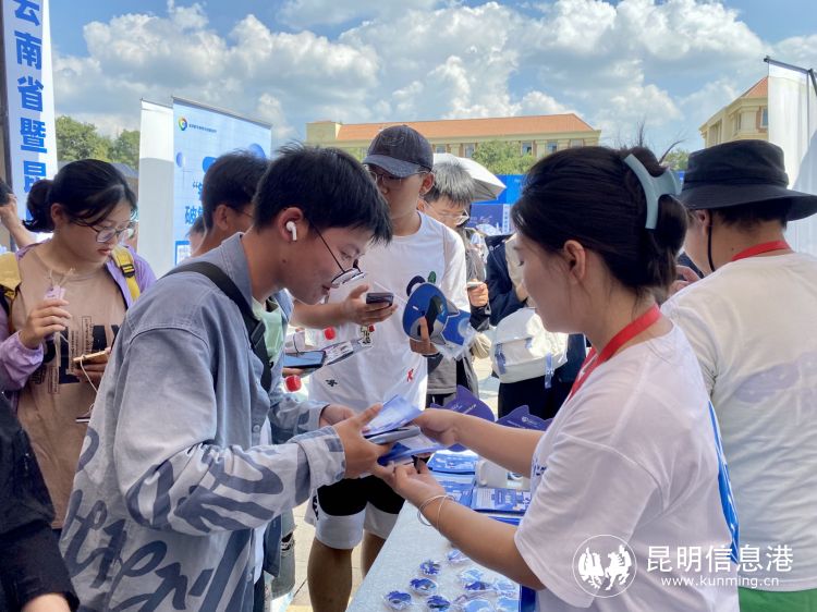 工作人员为大学生发放宣传册。记者曹芸/摄