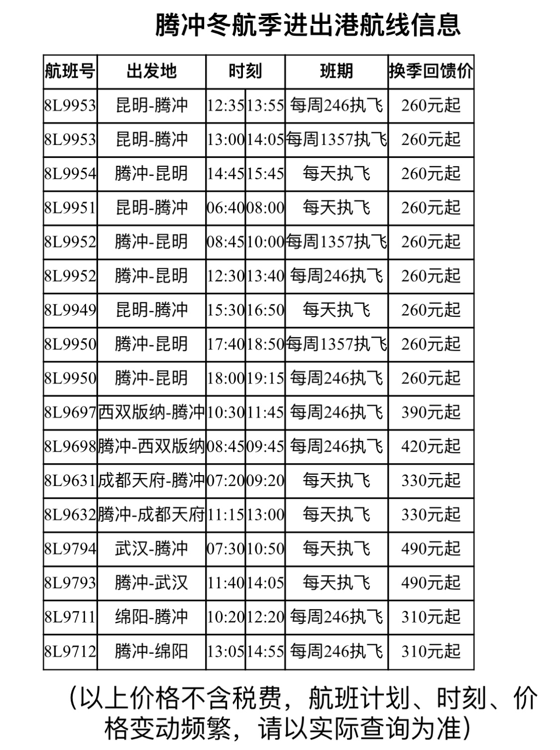 腾冲地处云南省西部,气候温和,地质资源丰富,历史底蕴厚重,拥有火山热海、和顺古镇、北海湿地、滇西抗战纪念馆、银杏村等一批核心景区。冬游腾冲,可欣赏独特美景,享受舒适温泉。据介绍,针对冬春航季腾冲地区新开及加密航线,祥鹏航空推出开航票价,昆明=腾冲单程260元起、成都天府=腾冲单程330元起、武汉=腾冲单程490元起、绵阳=腾冲单程310元起。