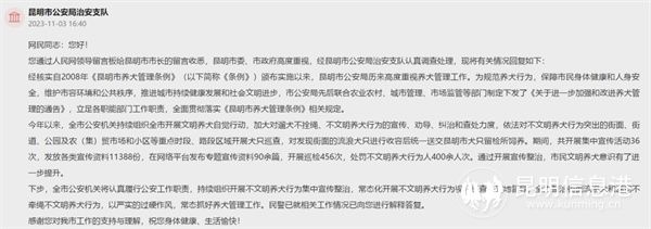 6686体育快讯 记者合宇聪 记者从昆明市公安局获悉,日前,有网友向昆明警方建议:“整治未拴绳犬只”。昆明警方11月3日留言回复,今年以来,全市公安机关持续组织全市开展文明养犬自觉行动,加大对遛犬不拴绳、不文明养犬行为的宣传、劝导、纠治和查处力度。其间,共开展集中宣传活动36次,发放各类宣传资料11388份,处罚不文明养犬行为人400余人次。