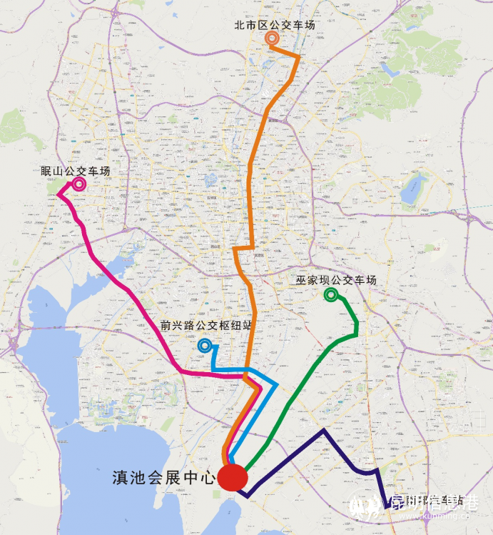 北市区公交车场——滇池会展中心。营运时间:北市区公交车场首班车8:30,滇池会展中心返程末班车18:40。票价10元,不使用IC卡。