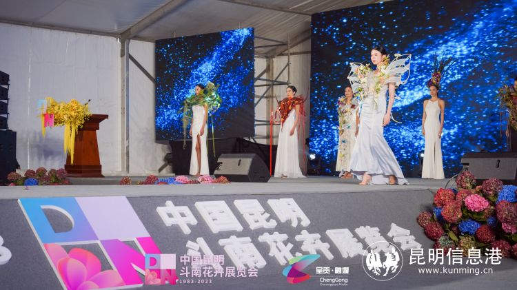 中国昆明斗南花卉展览会开幕。人体花艺走秀