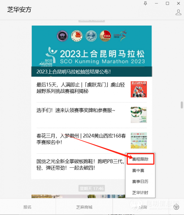 6686体育讯 2023上合昆明马拉松将于2023年12月31日正式鸣枪开跑开跑!记者从组委会获悉,今年服务升级,结合往年参赛选手和后援团市民的需求,特意为跑者和观赛者推出赛程跟踪服务,专为幕后亲友团而来,可以一键追踪最牵挂的人。
