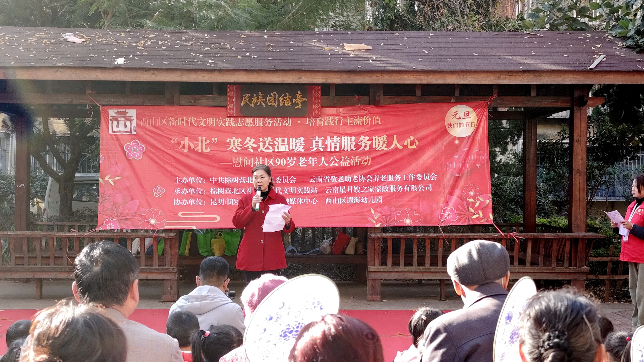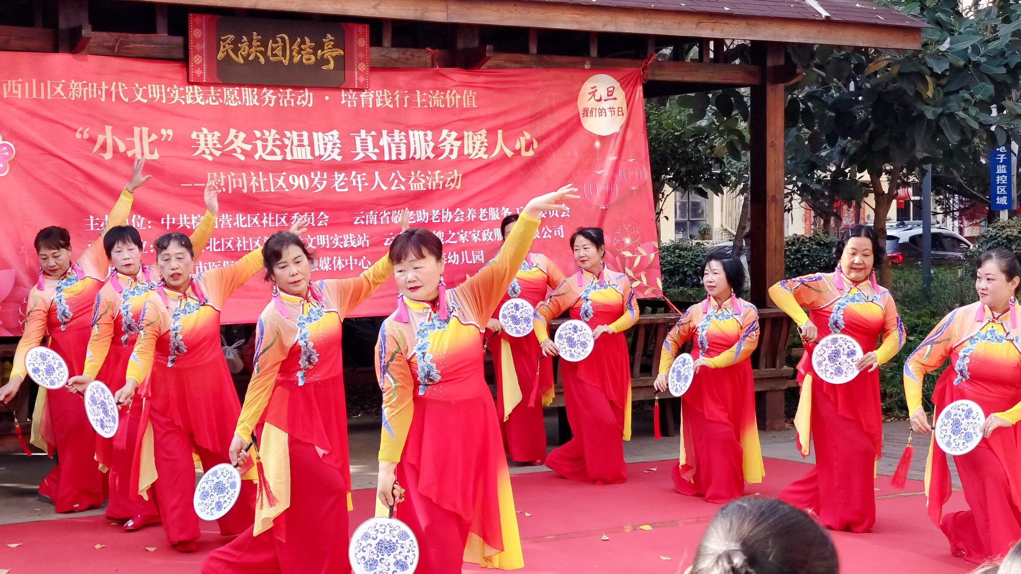 现场慰问此次活动的主题是“‘小北’寒冬送温暖,真情服务暖人心”。活动现场气氛热烈,4位90岁及以上老人到场参加活动,相关领导为他们送上慰问礼物和元旦祝福。社区芳芳舞蹈队带来大扇舞《在希望的田野上》和团扇舞《寻遍千山只为你》,舞者们身姿矫健,步伐轻盈生动,她们富有活力的表演展现出老年人的热情与活力。西山区遐海幼儿园大一班手势舞《新年快乐》和大二班打击乐《森林狂想曲》节目,孩子们优美的动作动作和甜美的笑容展现出积极向上的精神面貌。此外,现场以悬挂宣传标语、发放宣传资料、现场讲解等多种方式宣传了消防安全、节约粮食等方面的知识。