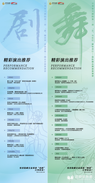 与音乐会一同举办的还有云南省大剧院新一年《“剧”精会神·戏剧润情——精品戏剧展演季》的演出一览。2024年的戏剧季依旧精彩不断,有包括天津人民艺术剧院打造的曹禺名作改编话剧《雷雨》《日出》等在内的8部舞台“实力派”戏剧经典佳作汇集,让古今中外的文学经典跃然于舞台之上。