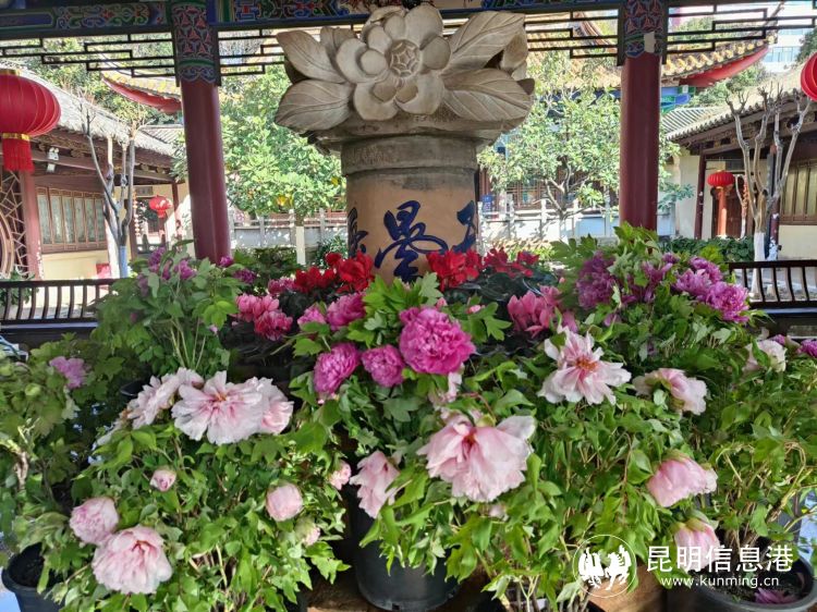 来到昙华寺公园,只见园内各类姹紫嫣红的牡丹已进入盛花期,寓意富贵吉祥的硕大的牡丹花盘红如火、白似雪,花大色艳、雍容华贵、芳香浓郁,观赏效果极佳。园内还特别设计了“昙华天香”“迎新春”2组牡丹主题展点。在传统春节到来之即,昙华寺“国花”牡丹展作为全国最早的牡丹展,将与广大昆明市民及游客共庆新春佳节。加入催花手段的牡丹将与正常花期的牡丹在公园内呈现持续开放之势,整个牡丹花展将持续开放到3月底,游客们可前来一饱眼福。