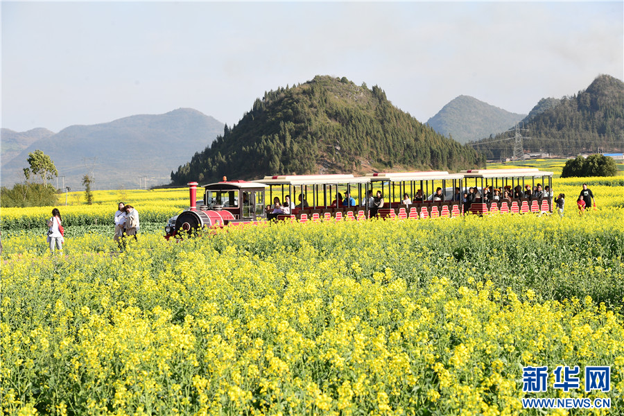 游人在云南省罗平县乘坐小火车穿越油菜花海(2月20日摄)。