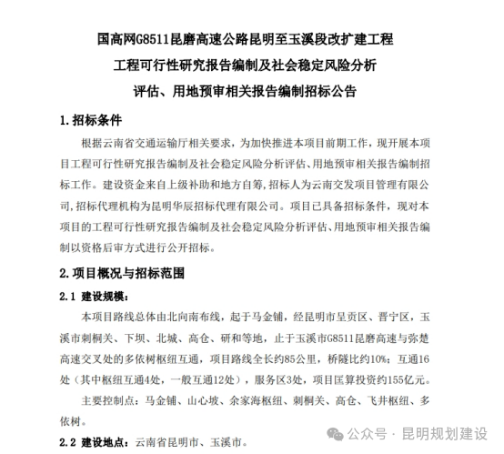 近日,云南省公共资源交易中心发布“国高网G8511昆磨高速公路昆明至玉溪段改扩建工程”工程可行性研究报告编制及社会稳定风险分析评估、用地预审相关报告编制招标公告。