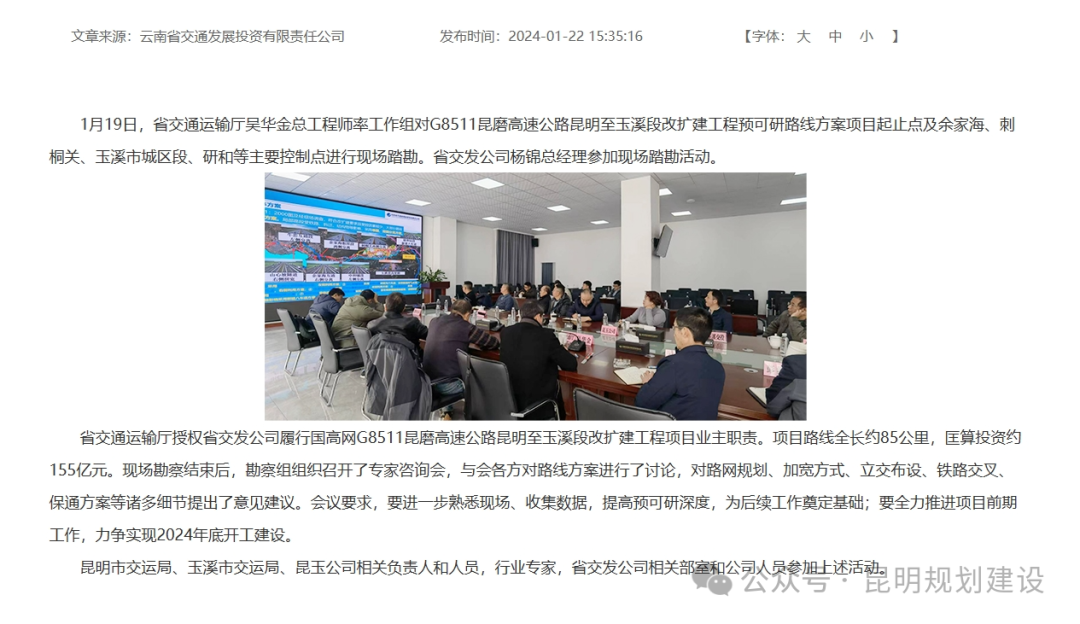 今年1月,云南省交通发展投资有限责任公司发布消息,省交通运输厅授权省交发公司履行国高网G8511昆磨高速公路昆明至玉溪段改扩建工程项目业主职责。