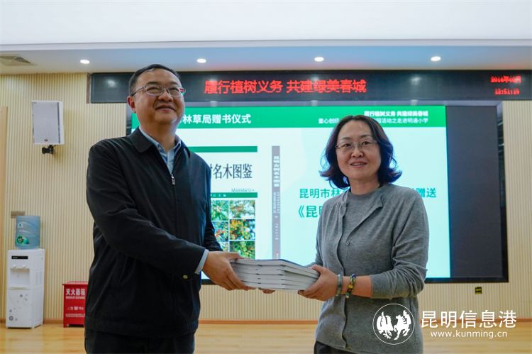 市林草局党组成员、副局长李伊向明通小学明通巷校区副校长杨姝赠送《昆明古树名木图鉴》,该书于近日首次对外发布。李伊表示,希望真正将古树名木保护宣传与文教结合,让同学们不仅在公开课堂获得知识,今后仍能透过书本了解古树名木知识,担任宣传古树名木保护的小使者。(市林草局供图)