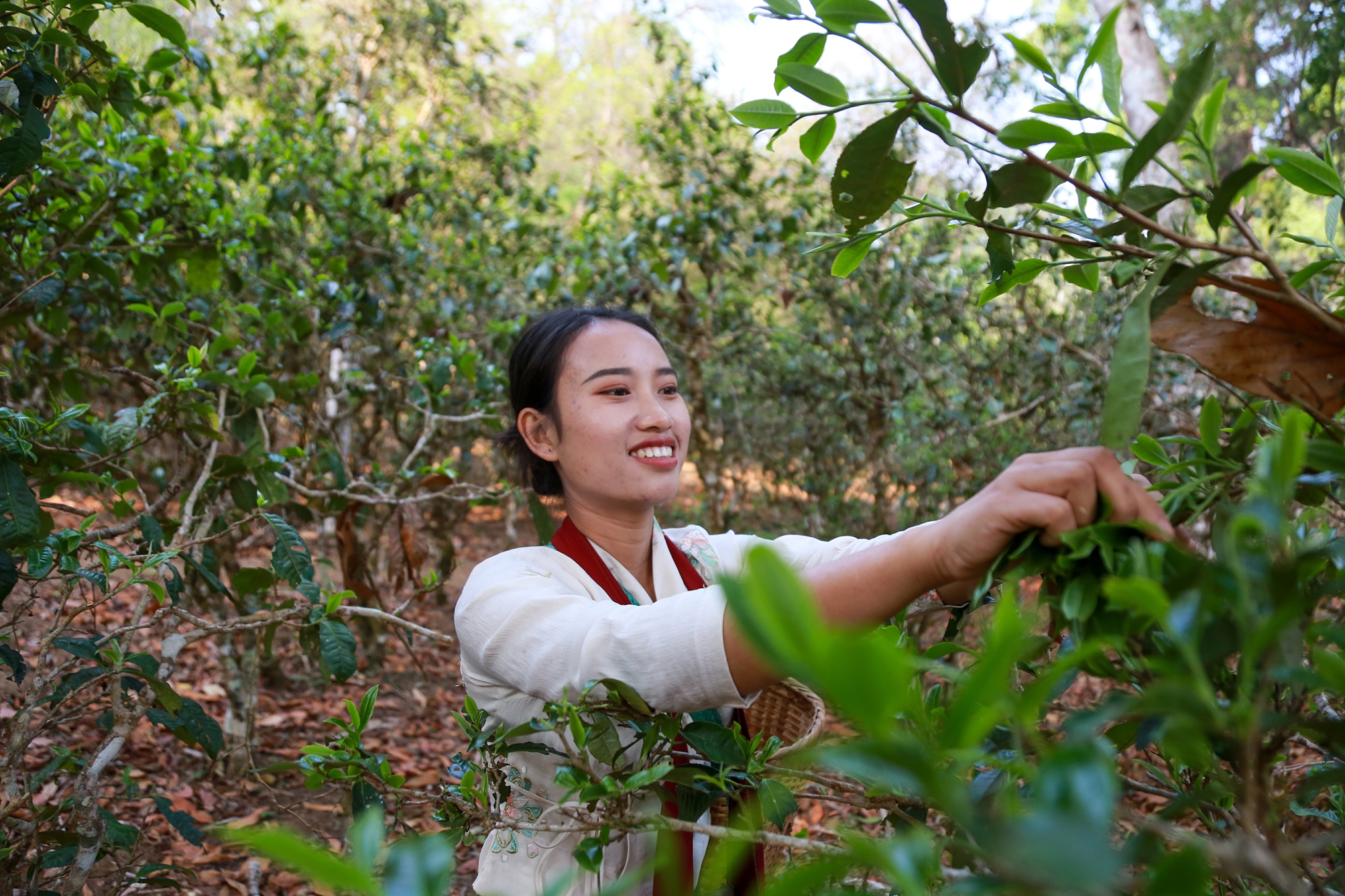 在景迈山古茶林核心区大平掌古茶园,一位“00后”的傣族姑娘——仙金邀请我们一道同她一起采摘春茶。